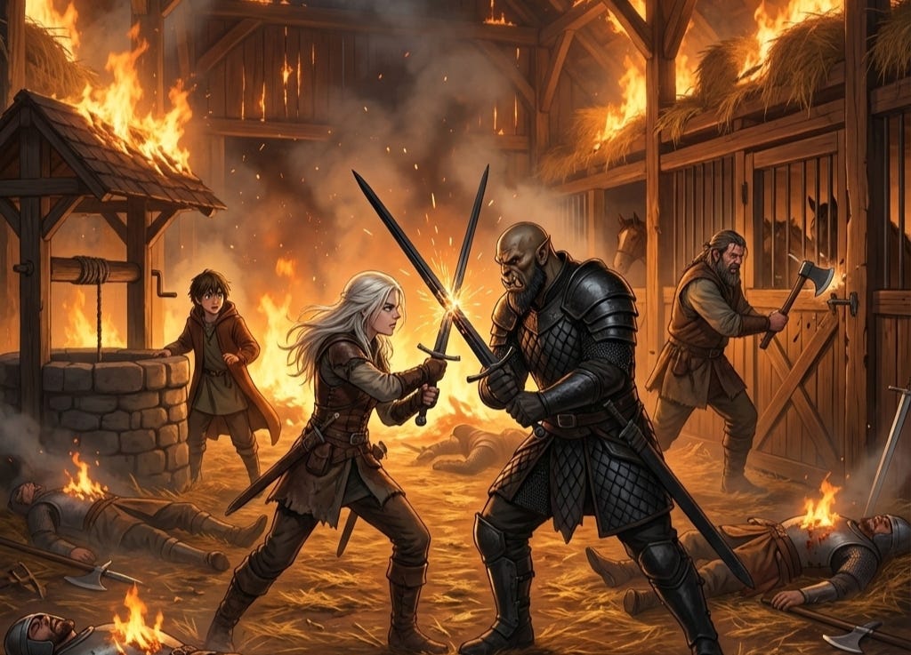 Sydney turned around just in time to dodge an overhead strike. His opponent easily pivoted and pressed his advantage. Though Sydney parried, each time it pushed him further from his position. As he dodged a mighty swing by the battle-axe-wielding guard, the man’s weapon became lodged in the barn wall. The guard struggled to free his axe, giving Sydney’s sword just enough time to caress his heart.
